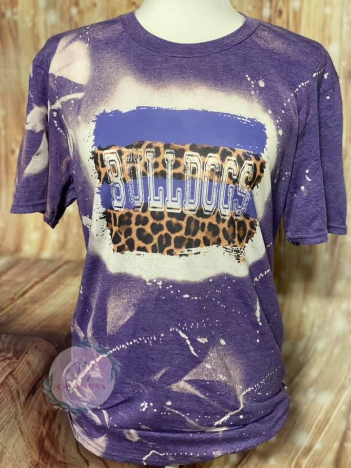 This school bulldogs tee has been expertly bleached, creating a unique leopard print design. Made with high-quality materials, this tee offers both durability and style. Perfect for showcasing your school spirit in a trendy and eye-catching way.